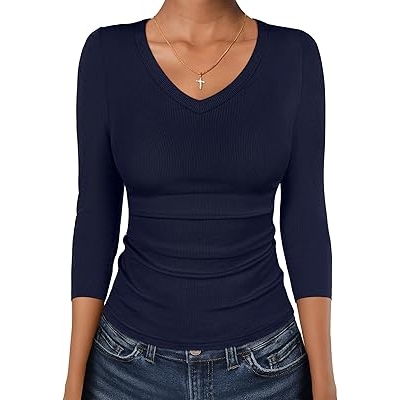 ANRABESS Womens Tops 34 Sleeve V Neck Ribbed Knit Slim Fit Shirts Basic Tee 2026 Fall Outfits Casual Tshirt Fashion Clothes